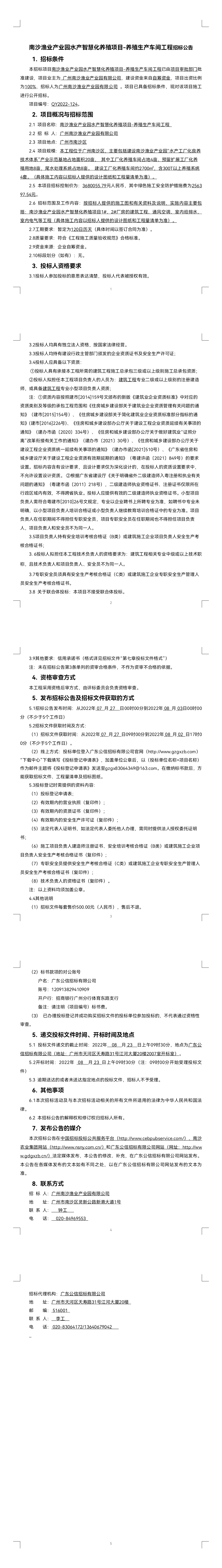 南沙漁業產業園水產智慧化養殖項目-養殖生產車間工程招標公告